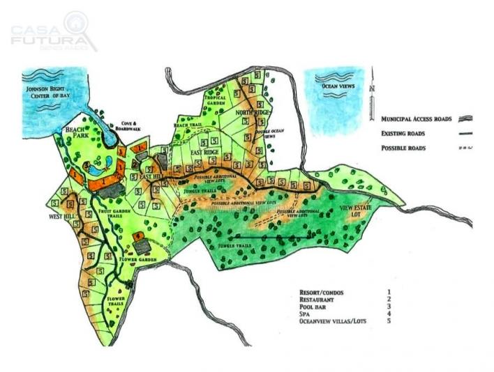 Informacion General de la Isla de Roatan Roatán es una isla caribeña ubicada a 40 millas de la costa de Honduras. Las aguas cristalinas, las arenas blancas y un arrecife frente a la costa ofrecen esnórquel, buceo y natación sin igual en ningún otro lugar La temperatura diaria promedio es de 28 grados centigrados durante todo el año y 21 grados centigrados por la noche. La isla se refresca con suaves vientos alisios y ventajosamente se encuentra fuera del cinturón de huracanes. Con vuelos directos desde Houston, Atlanta, Miami, Toronto; ¡Es fácil llegar! ¡Solo un vuelo corto desde los EE. UU. y Canadá VENTAJAS PARA EL INVERSIONISTA: • El estado libre de impuestos está disponible • Los costos de desarrollo son muy bajos! Los materiales de construcción de calidad están fácilmente disponibles. • Atención médica económica • El ingles es ampliamente hablado • Muy bien ubicado: bancos, tiendas, restaurantes y más a solo 10 minutos en French Harbour. FANTASTICA UBICACION: Hermosa propiedad frente a la playa ubicada en la costa norte en Johnson Bight, José Santos Guardiola, Roatán, Islas de la Bahía, Honduras. La propiedad está bien ubicada a solo 7 minutos de un campo de golf de clase mundial, Black Pearl en Pristine Bay. Además, la propiedad está a solo 10 minutos de French Harbour ó a 30 minutos del aeropuerto internacional. ¡La propiedad cuenta con una playa de casi 5 acres con una bahía privada! La propiedad tiene numerosos sitios de construcción. La propiedad está bien mantenida con un camino, tiene un manantial de agua dulce natural, ¡un hermoso paisaje exuberante esperando por ti! ¡Las posibilidades son infinitas con esta gran parcela de tierra! Un plan de desarrollo potencial para la propiedad se encuentra en la página siguiente. Hay un Diseño Conceptual de un proyecto y destaca las características especiales de la propiedad: • Las vistas al mar están disponibles desde la mayoría de las áreas de la propiedad: hay 7 colinas con vista al mar que están coloreadas en marrón claro en el mapa. • Un pozo artesanal que alimenta la propiedad durante todo el año. • Se puede acceder a la propiedad desde dos caminos municipales que se muestran. • Hay electricidad a tres lados de la propiedad. • El agua está fácilmente disponible y el 90% de las carreteras están instaladas y solo necesitan mejoras. • Ya existen 54 lotes potenciales, la mayoría de 0,5 acres de tamaño. Los sitios más cercanos a la playa serían sitios ideales para villas de cuatro complejos. • Esta propiedad ofrece una gran flexibilidad para una variedad de desarrollos y un enfoque por etapas para un complejo que sería privado, virgen y natural. • El área directamente detrás del Beach Park es plana hacia la vía de acceso municipal. • La propiedad sería un escenario ideal para un resort o complejo de unidades de condominios y restaurantes, ubicado entre los jardines de frutas y flores existentes. • También hay espacio para un Centro de Tratamiento de Turismo Médico y Spa que podría ser una excelente fuente de ingresos para la propiedad. Se realizo un estudio de factibilidad para un Medi-Spa. • El Beach Park frente al mar podría incluir el complejo de piscinas y un bar en la piscina. • También se muestra una Bahía donde hay un muelle que da acceso a paddle boards, snorkel y kayaks. • El acceso a botes grandes es fácil a través de la abertura en el arrecife, directamente en alta mar. • El campo de golf está a 5 minutos en bote hacia el oeste y este proyecto podría tener un muelle para acceder a los botes. • La propiedad tiene una playa privada de casi 5 acres • La playa es de arena natural perfecta para un resort, hotel o desarrollo privado de lujo • Zona donde se podría hacer una marina con aguas profundas • Las posibilidades son infinitas, un club de playa, restaurantes, marina etc El area de terreno tiene 53 acres que equivale a 30.69 manzanas