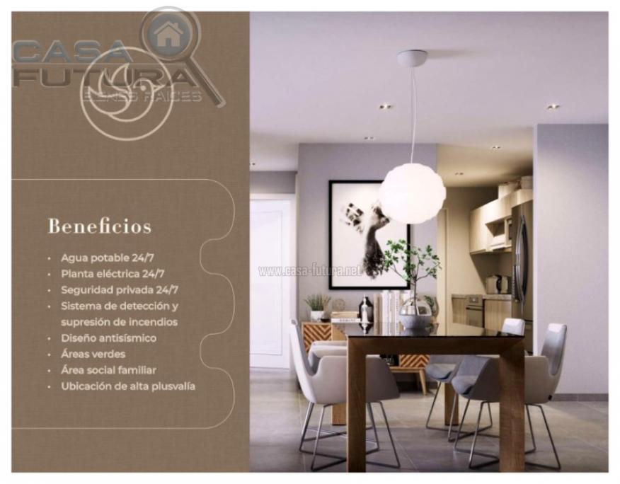 DESCRIPCION • Area de construccion aproximada: 48.6 m2 • Sala – comedor • Cocina • Habitaciones: 1 • Baños completos: 1 • Estacionamientos: 1 • Area de lavanderia privada • Balcon: 1 AMENIDADES • Cine • Gym • Area de barbacoa • Area de juegos para niños tanto interior como exterior • Área para mascotas • Piscina BENEFICIOS • Seguridad 24/7 • Planta eléctrica 24/7 • Agua potable 24/7 • Sistema de detección y supresión de incendios • Diseño antisísmico • Áreas verdes • Área social familiar • Ubicación de alta plusvalía • Ubicación privilegiada y exclusiva • Finos y modernos acabados en todas las áreas