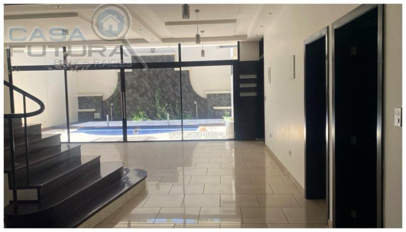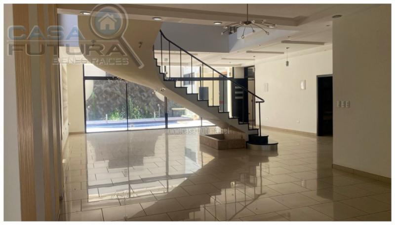 Casa en venta en Lomas del Guijarro Sur MEDIDAS APROXIMADAS: • Area de terreno: 536 v2 • Area de construccion: 988 m2 • Niveles: 4 AREAS Y AMBIENTES: PLANTA A NIVEL DE CALLE: • Estacionamientos independientes techados con motor eléctrico: 4 • 2Bodegas para insumos de la residencia • 2 Bodegas con estanteria metalica perimetral y central • Cuarto de Equipos • Cisterna de 10,000.00 galones con equipo hidroneumático • Calentador central con tanque de 50 galones • Area de lavanderia: pila de bloque reforzado, Instalaciones para lavadora y secadora, tendedero de ropa • Dormitorio de empleada con baño :1 • Sistema de tuberías para instalación de piscina • Pasillo de servicio perimetral para ingresar al área de patio interior PLANTA BAJA (AREA SOCIAL INTERIOR) • Sala principal con instalaciones para bar interior • Comedor principal • Escaleras de concreto reforzado forradas de madera • Baño de visitas • Cuarto de estudio / música • Cocina con muebles y top de granito • Alacena • Escalera de caracol interior que conecta todos los niveles de la casa PLANTA BAJA (AREA SOCIAL EXTERIOR) • Patio con piso antiderrapante • Jacuzzi con equipo y calentador • Piscina (obra gris) 7 x 2.70 x 1.50 • Deck de madera sobre hueco de piscina • Cuarto de juegos con instalaciones y mueble de bar • Baño completo para área de piscina NOTA: Toda el área de la planta baja esta alambrada con esperas para parlantes, en el cielo falso se encuentra una tubería de llenado de la piscina y/o jacuzzi que atraviesa el pasillo perimetral, en la alacena se encuentran dos tableros eléctricos independientes (separados los equipos de aire acondicionado) PLANTA ALTA (AREA DE LOFTS Y HABITACIONES) • Habitacion principal con cuarto de baño que incluye 2 lavamanos y tina con jets, • Walking closet en habitación principal con estantería metálica para ropa y zapatos • Salita de descanso • Sala de teatro / familiar o habitación de huéspedes con baño completo • Área de lavanderia completa con estantes metálicos, instalaciones para equipos, 2 piletas, • Dormitorio de visitas con baño privado completo y tina con jets • 2 Lofts con mezzanines para dormitorios y balcones metálicos con baño completo cada uno y tina con jets PLANTA ALTA NIVEL 4 (AREA DE TERRAZAS) • Terraza techada, abierta en 2 costados con vista panorámica a la ciudad • Área de bar con lavatrastos industrial y muebles de pared • Baño de visitas • Calentador auxiliar independiente • Área de terraza abierta con bancas de concreto y piso de cerámica NOTA: Todas las habitaciones, cuarto de música, cuarto de teatro incluyen unidades minisplits de aire acondicionado NOTA: El cuarto de teatro tiene aislamiento para sonido y temperatura y doble pared