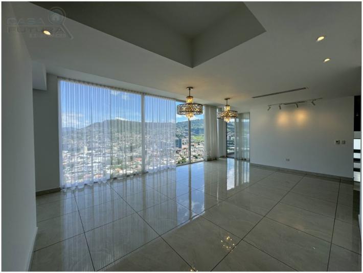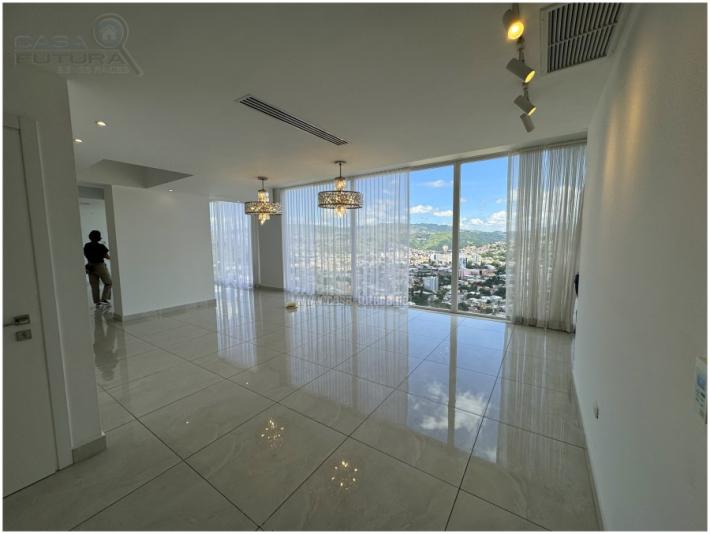 Moderno apartamento con vista espectacular a la ciudad de Tegucigalpa. DESCRIPCION • Area de construccion aproximada: 450 m2 • Dormitorios: 4 • Baños completos: 4 • Baño de visitas: 1 • Amplia sala con hermosa vista • Amplio espacio de comedor • Cocina con isla y finos muebles • Top de cuarzo en cocina • Areas de lavanderia: 2 • Dormitorios de empleada: 2 • Estacionamientos: 3 • Bodega de aproximadamente 20 m2 • Aires acondicionados • Acabados de lujo. ELECTRODOMESTICOS EN COCINA • Cook top • Horno • Microondas • Refrigeradora • Lavaplatos • Lavadora de ropa • Secadora de ropa. ACCESORIOS 1. Lamparas 2. Cortinas 3. Espejos 4. Closets DESCRIPCION GENERAL DEL EDIFICIO: • Cero trafico de acceso • Vistas panoramicas de la ciudad de Tegucigalpa • Area de recepción / lobby amplio y elegante • Fachada con drive-way techada • 2 Elevadores de lujo • Sotanos de estacionamiento • Estacionamiento de visitas • Seguridad 24 horas con monitoreo • Planta eléctrica • Pisos de porcelanato • Puertas europeas AREA SOCIALES: • Amplio y moderno Lobby • Piscina de adultos • Piscina de niños • Gym • Salon para eventos • Terraza • Kids club