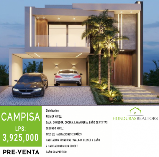 SAN PEDRO SULA, PRE-VENTA RESIDENCIAL CAMPISA - PRECIO: L3,925,000 RESERVA CON $5000 CUOTA APROXIMADA L31,100 DISTRIBUCIÓN: PRIMER NIVEL: SALA, COMEDOR, COCINA, LAVANDERIA, BAÑO DE VISITAS. SEGUNDO NIVEL: TRES (3) HABITACIONES, 2 BAÑOS. HABITACIÓN PRINCIPAL: WALK-IN CLOSET Y BAÑO, 2 HABITACIONES CON CLOSET, BAÑO COMPARTIDO