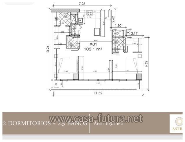 DESCRIPCION APARTAMENTO DE 2 HABITACIONES (MODELO 1) • Area de construcción: 103.10 m2 • Habitaciones: 2 • Baños completos: 2 • Baño de visitas: 1 • Sala - comedor • Cocina con muebles • Closets • Balcon