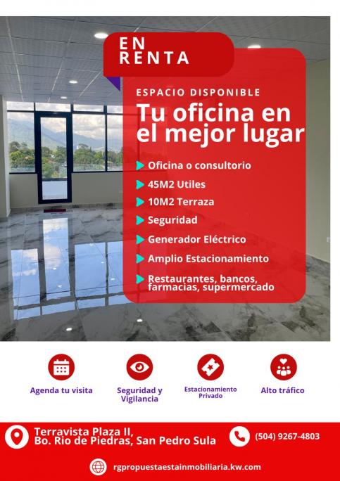 ¡No busques más! Te presentamos este increíble local en el edificio Terravista Plaza II en Rio de Piedras, San Pedro Sula, completamente terminado y con detalles como ser piso de porcelanato, cielo falso, iluminación, toma corrientes y aires acondicionados tipo inverter. Este es un espacio amplio y funcional de 45 m² útiles y 10 m² de terraza que te dejará sin aliento. Ubicado en el prestigioso Edificio Terravista Plaza II, este local no solo ofrece un ambiente moderno y funcional, sino que también cuenta con una espectacular vista de la montaña y la ciudad. Imagina recibir a tus clientes o trabajar en un espacio que te brinda esa conexión con la naturaleza y la vibrante vida urbana. Características destacadas: - Superficie útil: 45 m² - Terraza privada: 10 m² - Vistas panorámicas que inspiran - 1 nivel de comercio para mayor visibilidad - 1 nivel de restaurantes para disfrutar de deliciosas opciones - 4 niveles de oficinas en el edificio - 4 niveles de estacionamiento con más de 200 espacios disponible