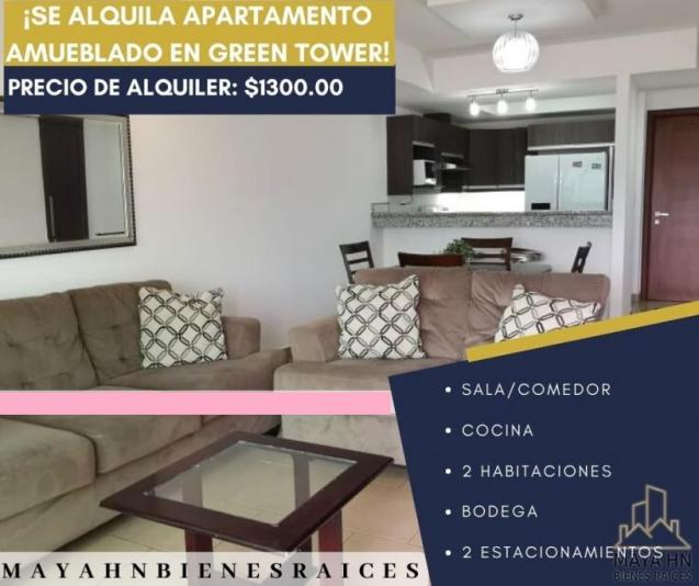 SE ALQUILA APARTAMENTO AMUEBLADO EN GREEN TOWER - El apartamento consta de sala/comedor - cocina con línea blanca - 2 habitaciones cada una con closet - 2 baños - una bodega - 2 estacionamientos, no se aceptan mascotas