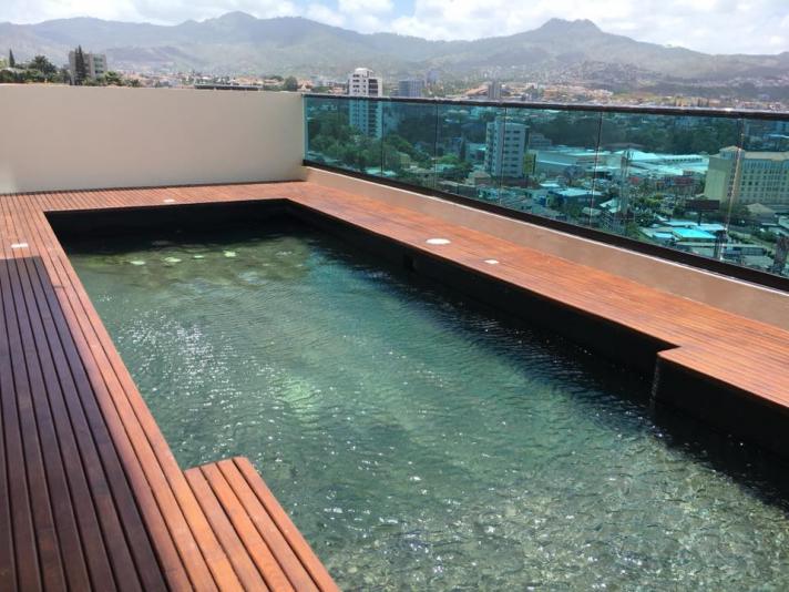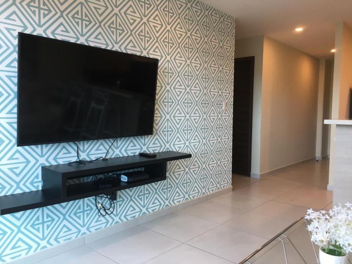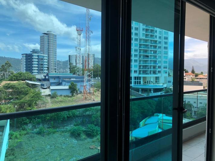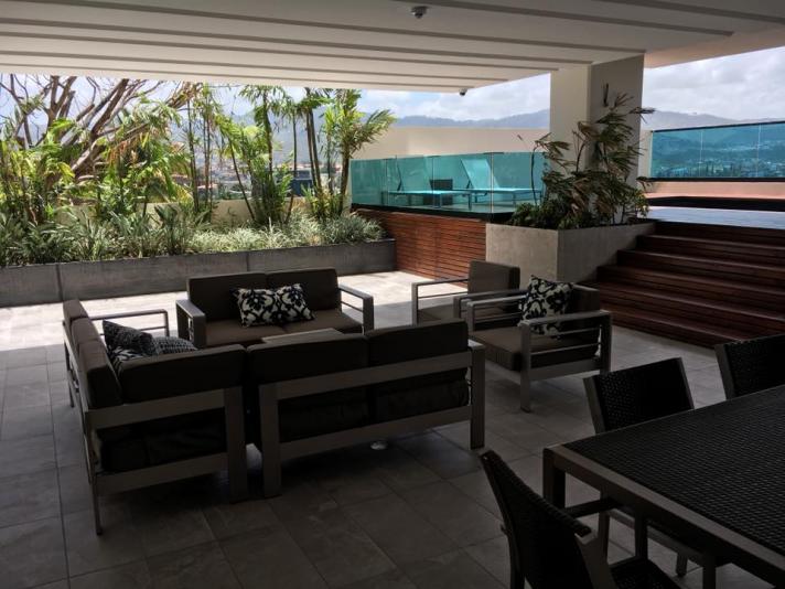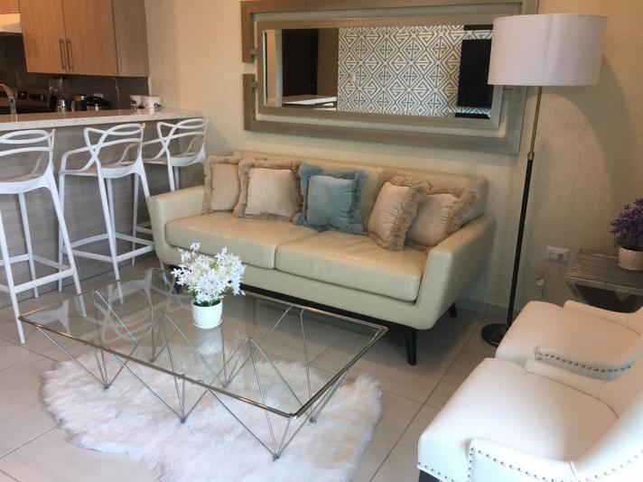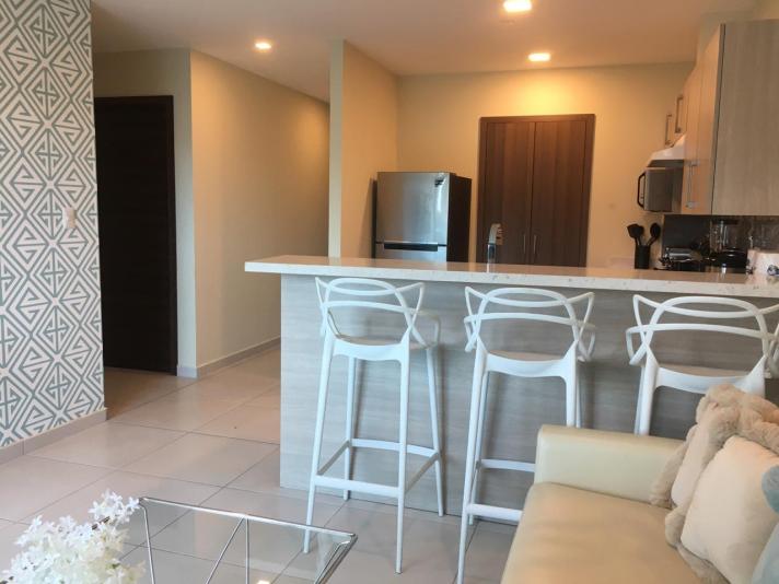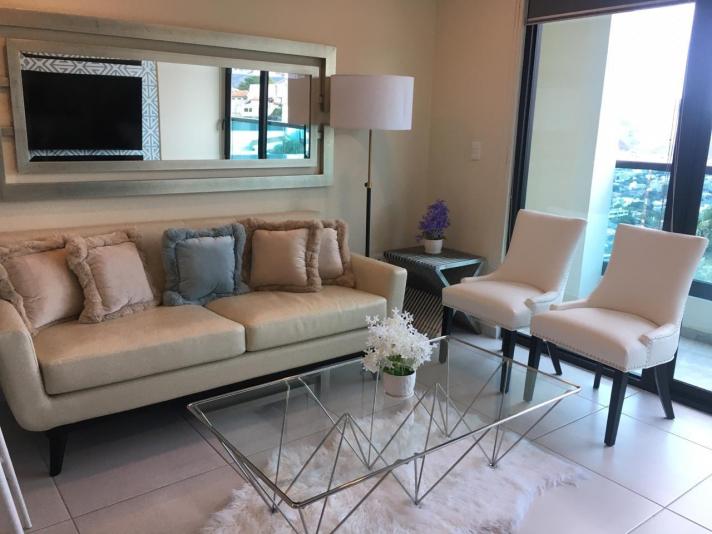 El apto. es amueblado completamente y consta 2 habitaciones, 2.5 baños, sala/comedor, cocina amueblada, desayunador, estufa, refrigeradora, lavadora y secadora, terraza con excelente vista, estacionamiento para 2 vehículos bajo techo, cuota de mantenimiento incluida, la torre cuenta con: estacionamiento, elevadores, piscina, gym, sala de cine, área de juegos, salón de eventos, área de barbacoas y fogatas