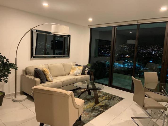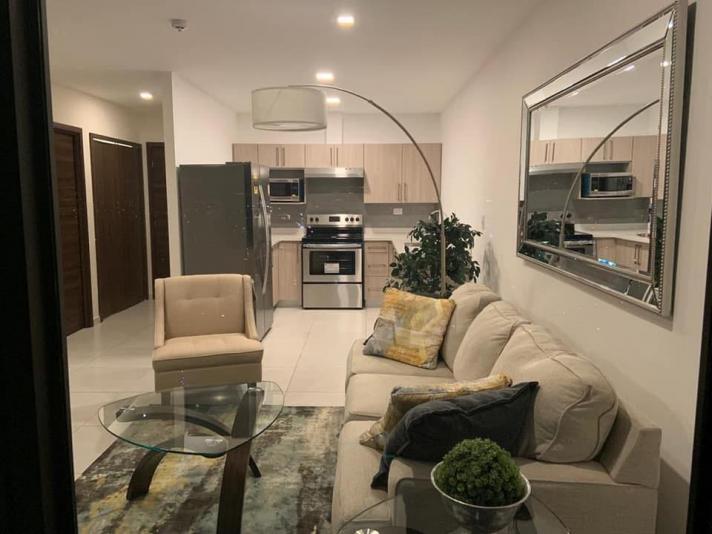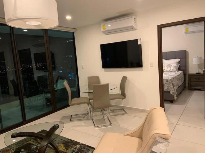 El apto. es amueblado y consta de 1 habitación, sala, comedor, cocina, 1.5 baños, la torre cuenta con: estacionamiento, elevadores, piscina, gym, sala de cine, área de juegos, salón de eventos, área de barbacoas y fogatas, incluye cuota de mantenimiento.