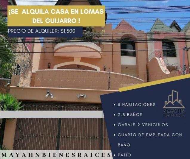 ¡SE RENTA TOWNHOUSE EN LOMAS DEL GUIJARRO! La vivienda consta de: PRIMERA PLANTA: garaje para 2 vehículos una bodega. SEGUNDA PLANTA: sala principal con terraza con vista a la ciudad baño de visita comedor cocina amueblada terraza frente al comedor cuarto de empleada con baño completo área de lavandería patio trasero. tercera PLANTA: sala de tv habitación principal con balcón y baño completo, dos habitaciones secundarias con su baño propio y uno de ellos con su terraza. además, consta de portones eléctricos de garage, cerco eléctrico, intercomunicador con cámara. Area de Terreno de 311 vrs2 Area de Construcción 250 mts2