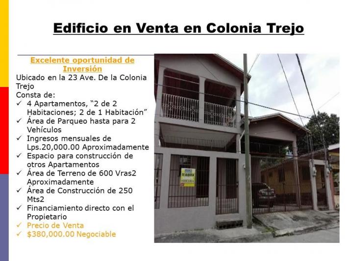 Excelente oportunidad de Inversión Ubicado en la 23 Ave. De la Colonia Trejo Consta de: 4 Apartamentos, “2 de 2 Habitaciones; 2 de 1 Habitación” Área de Parqueo hasta para 2 Vehículos Ingresos mensuales de Lps.20,000.00 Aproximadamente Espacio para construcción de otros Apartamentos Área de Terreno de 600 Vras2 Aproximadamente Área de Construcción de 250 Mts2 Financiamiento directo con el Propietario Precio de Venta LPS.3,800,000.00 Negociable
