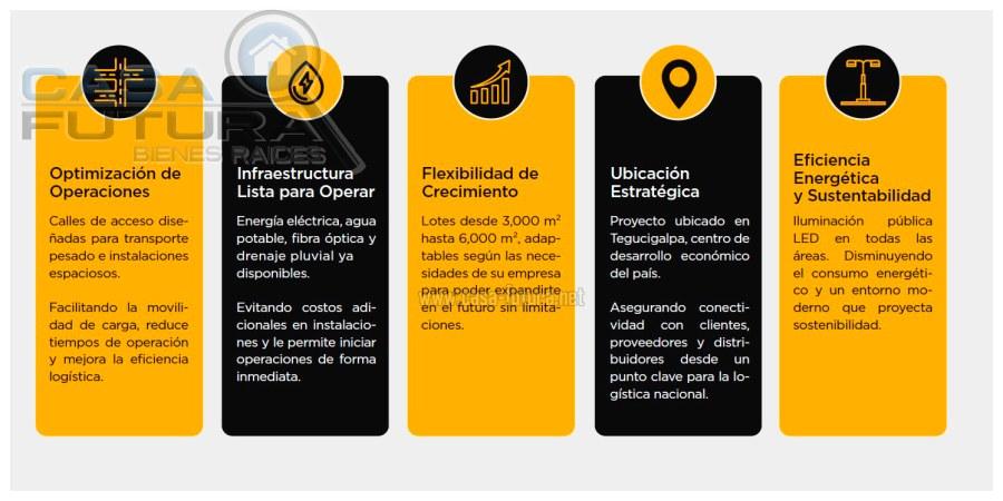Este parque industrial nace en el corazón de Tegucigalpa y esta diseñado para potenciar el crecimiento de empresas dedicadas al comercio industrial y logístico. Con infraestructura de primer nivel y una ubicación estratégica Esta pensado para empresas de ALTO PERFIL que buscan eficiencia, conectividad y competitividad y ofrecen operaciones logísticas y de comercio a gran escala. Esta ubicado en el Anillo periférico con acceso directo al Corredor logístico, facilitando conexión con puertos, aduanas y el resto del país Distancia en km de importantes puertos: Puerto Pacifico – Puerto Henecán San Lorenzo a 110 km Puerto Atlántico – Puerto Cortes a 303 km Aeropuerto Internacional Palmerola a 81 km DESCRIPCION DEL TERRENO EN VENTA: • Area de terreno: 4548.74 v2 • Iluminacion publica LED en todas las áreas disminuyendo así el consumo energético y un entorno moderno que proyecta sostenibilidad • Agua potable • Red de drenaje para aguas pluviales • Boulevard de acceso amplio para carga pesada • Energía eléctrica • Fibra óptica • Ideal para empresas nacionales e internacionales de ALTO PERFIL IDEAL PARA: • Centros de distribución de supermercados, farmacias ó e-commerce • Bodegas de importadores y exportadores • Procesadoras y empacadoras de alimentos • Ensambladoras de productos electrónicos o plásticos • Carpinteria industrial y metalmecanica liviana NOTA: Tenemos también terrenos mas grandes